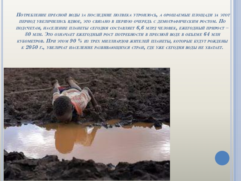 этот период увеличились вдвое, это связано в первую очередь с демографическим ростом. По подсчетам, население планеты сегодня составляет 6,6 млрд человек, ежегодный прирост – 80 млн. Это означает ежегодный рост потребности в пресной воде в объеме 64 млн кубометров. При этом 90 % из трех миллиардов жителей планеты, которые будут рождены к 2050 г., увеличат население развивающихся стран, где уже сегодня воды не хватает.