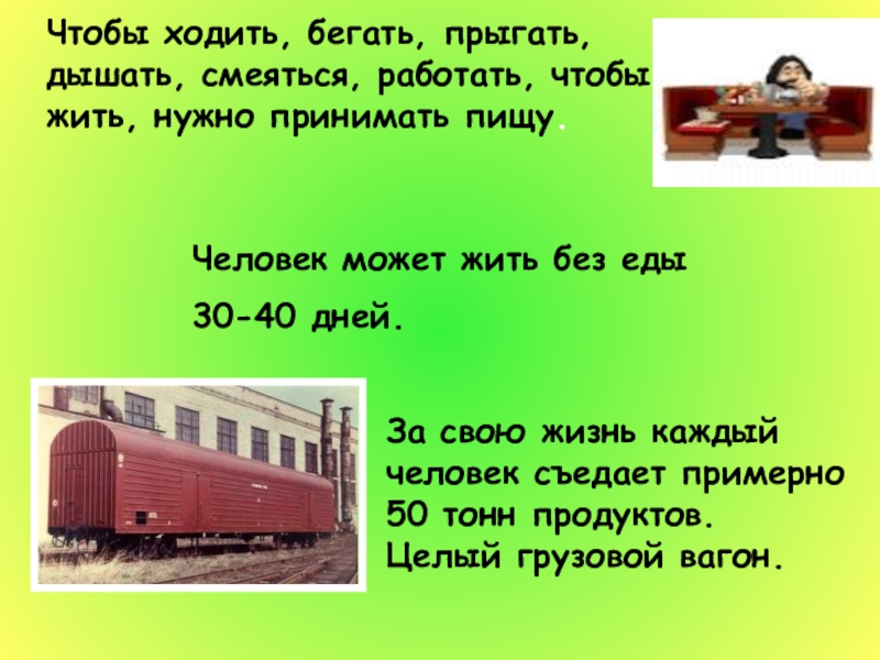 За свою жизнь каждый человек съедает примерно 50 тонн продуктов. Целый грузовой вагон.