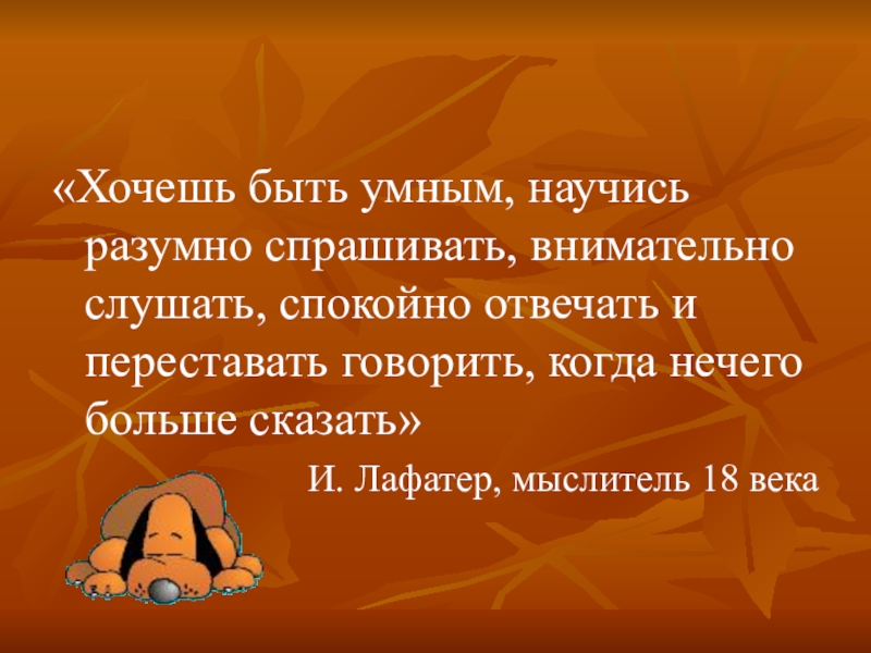 Слайд 3«Хочешь быть умным, научись разумно спрашивать, внимательно слушать, спокойно отвечать и