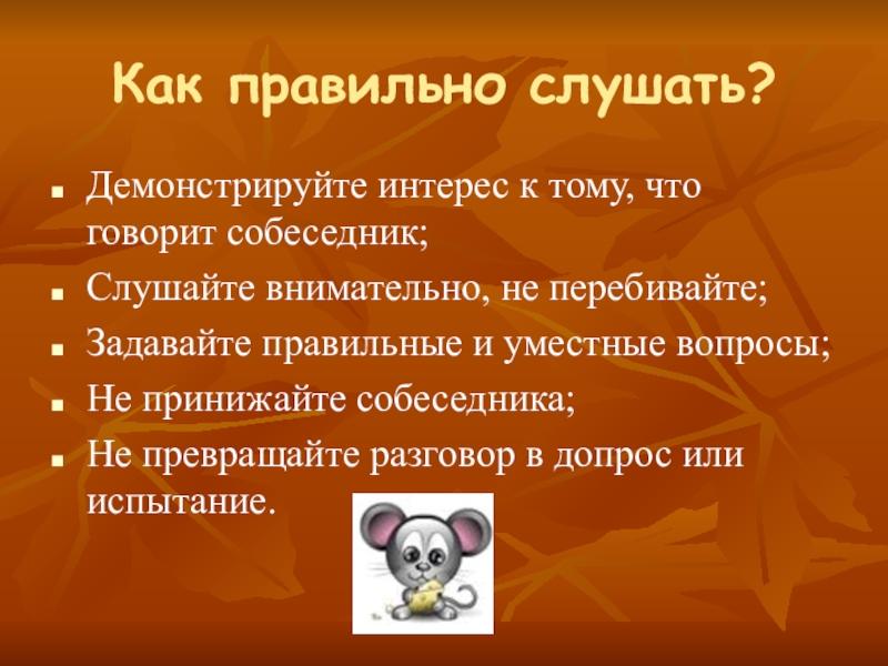 Как правильно слушать?Демонстрируйте интерес к тому, что говорит собеседник;Слушайте внимательно, не перебивайте;Задавайте правильные и уместные вопросы;Не принижайте