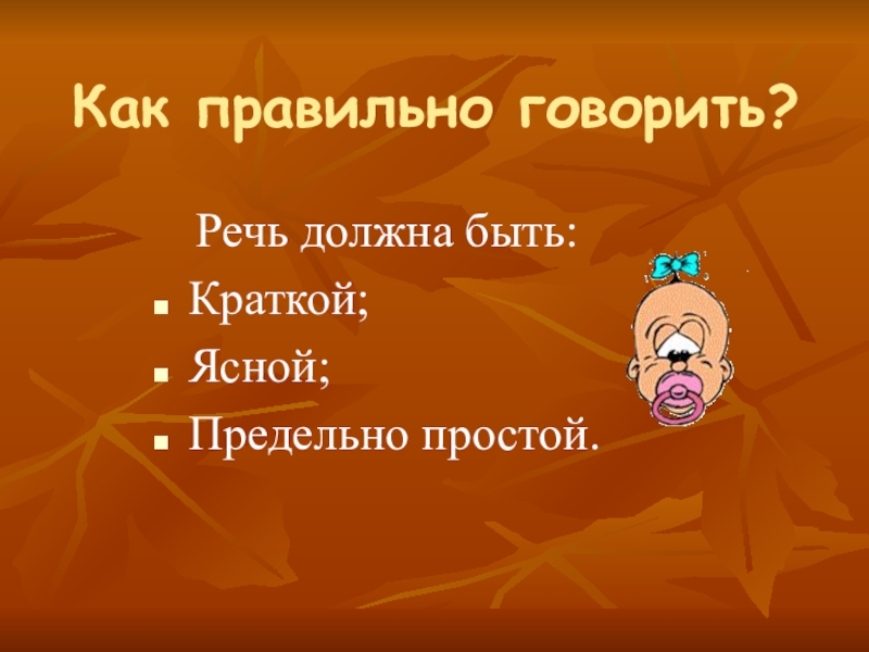 Как правильно говорить?Речь должна быть:Краткой;Ясной;Предельно простой.