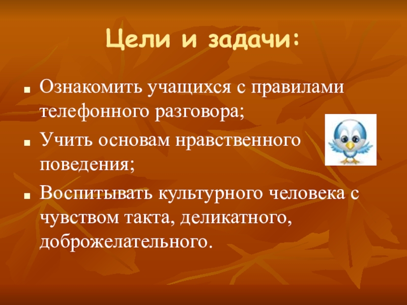Цели и задачи:Ознакомить учащихся с правилами телефонного разговора;Учить основам нравственного поведения;Воспитывать культурного человека с чувством такта, деликатного,