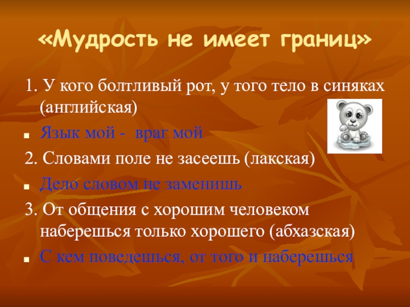«Мудрость не имеет границ»1. У кого болтливый рот, у того тело в синяках (английская)Язык мой - враг