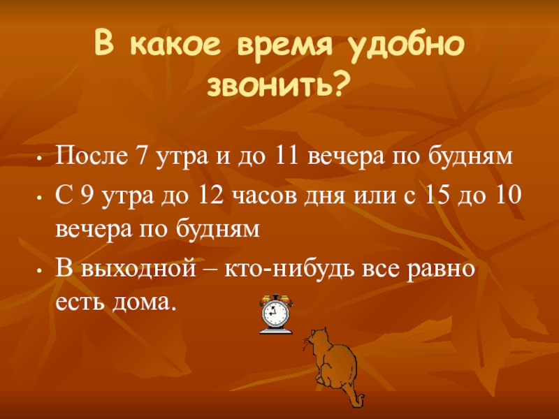 В какое время удобно звонить?После 7 утра и до 11 вечера по буднямС 9 утра до 12