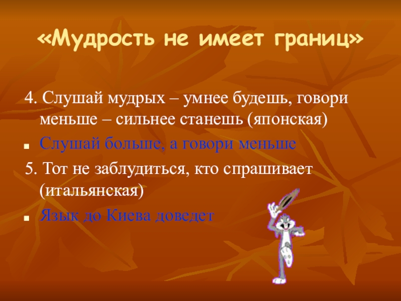 «Мудрость не имеет границ»4. Слушай мудрых – умнее будешь, говори меньше – сильнее станешь (японская) Слушай больше,