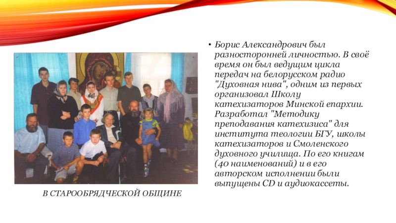 В старообрядческой общинеБорис Александрович был разносторонней личностью. В своё время он был ведущим цикла передач на белорусском