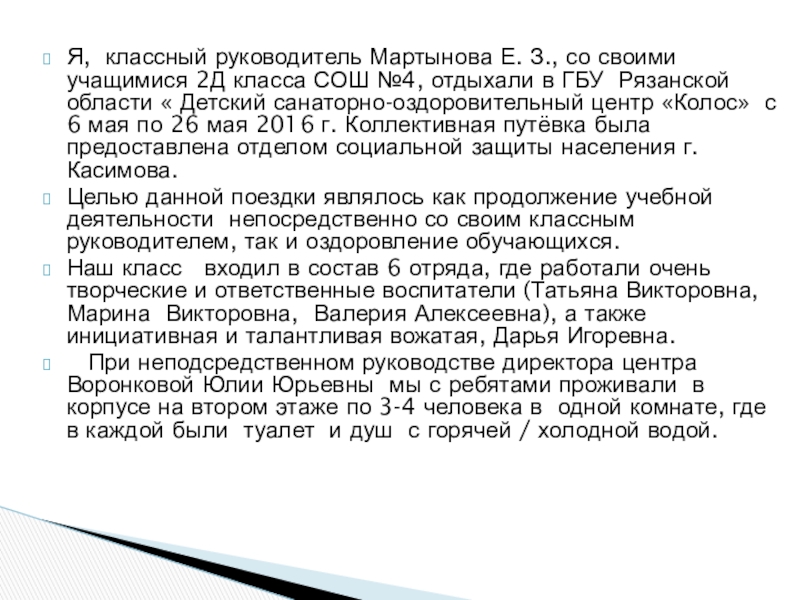 СОШ №4, отдыхали в ГБУ Рязанской области « Детский санаторно-оздоровительный центр «Колос» с 6 мая по 26 мая 2016 г. Коллективная путёвка была предоставлена отделом социальной защиты населения г. Касимова.