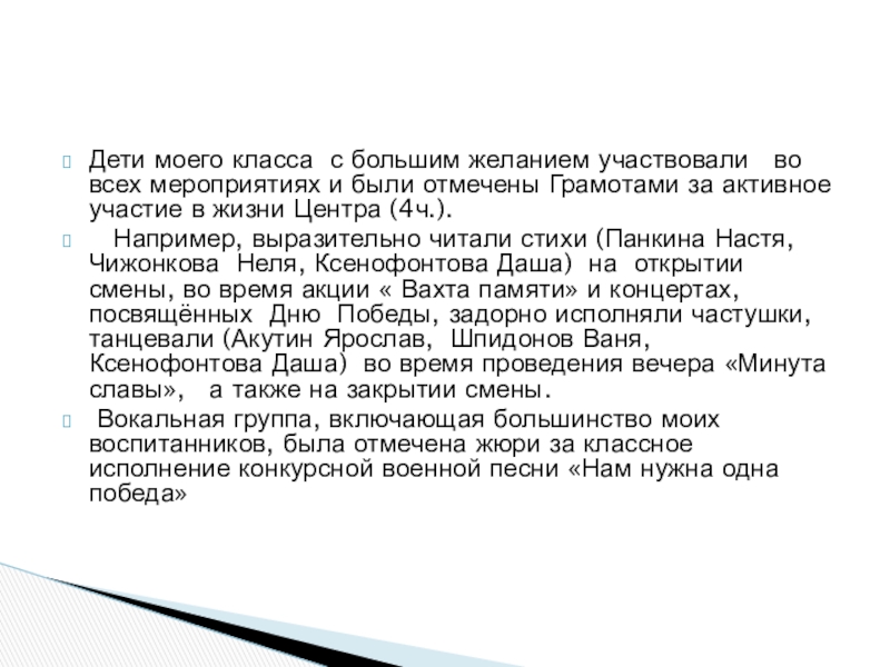 Наш класс входил в состав 6 отряда, где работали очень творческие и ответственные воспитатели (Татьяна Викторовна, Марина Викторовна, Валерия Алексеевна), а также инициативная и талантливая вожатая, Дарья Игоревна.