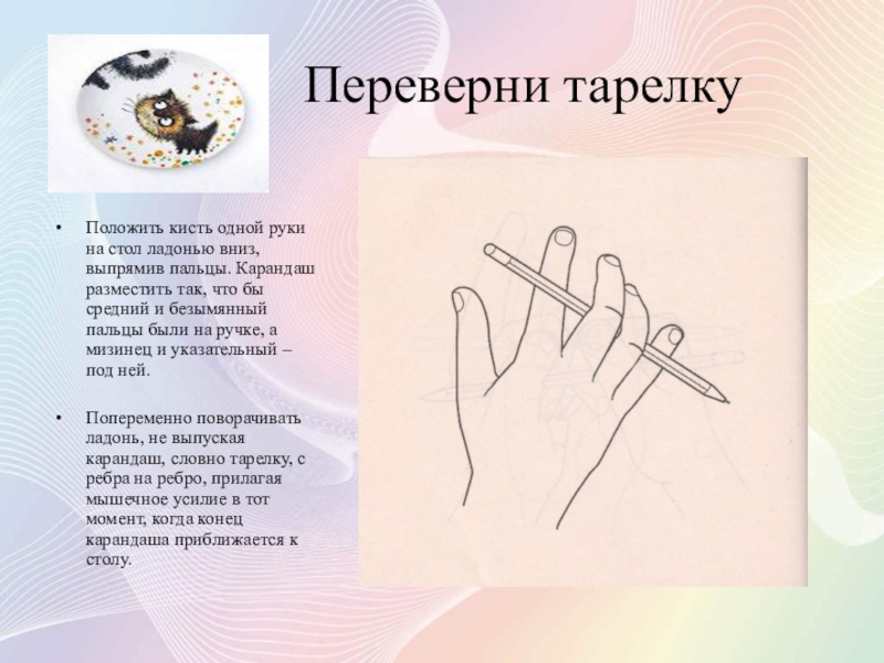 Попеременно поворачивать ладонь, не выпуская карандаш, словно тарелку, с ребра на ребро, прилагая мышечное усилие в тот момент, когда конец карандаша приближается к столу.