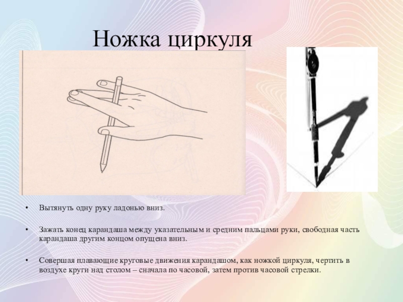 Поворачивать кистью руки вправо и влево, острым концом карандаша рисовать в воздухе над столом полукольца.