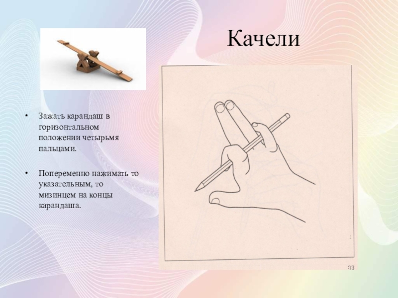 Слегка приподняв ладонь над столом, нажимать попеременно пальцами то на один, то на другой конец карандаша, не выпуская его. Напоминает балансирование тарелок весов.