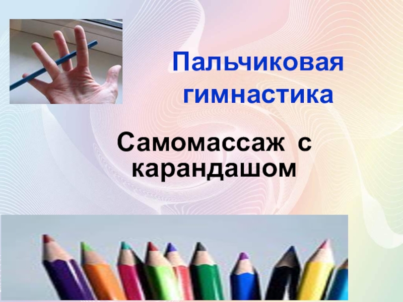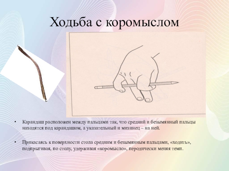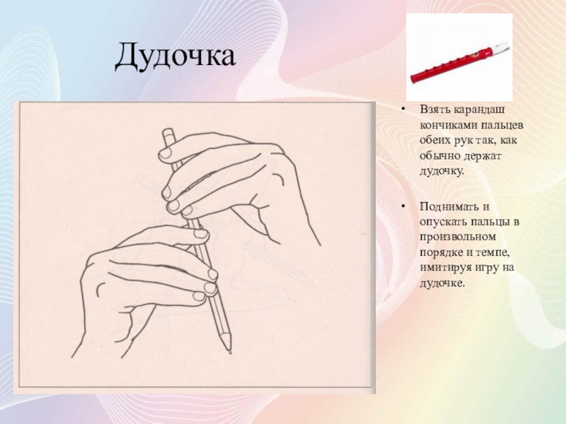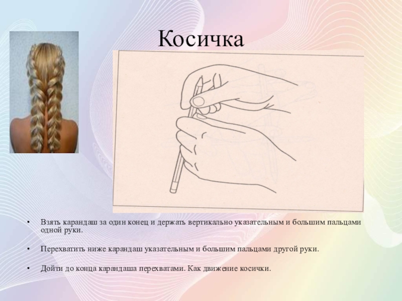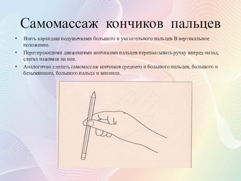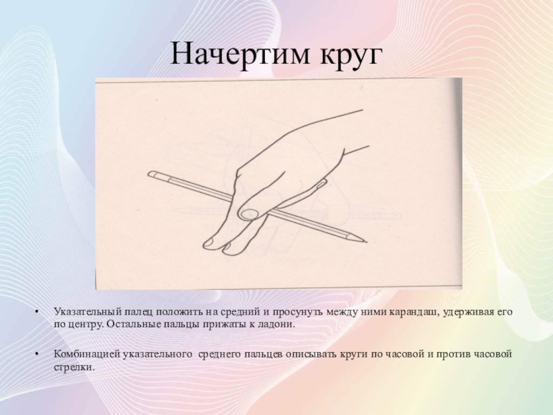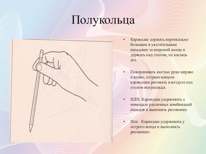 Разместить карандаш горизонтально так, чтобы средний палец был под карандашом, а остальные – на ней.