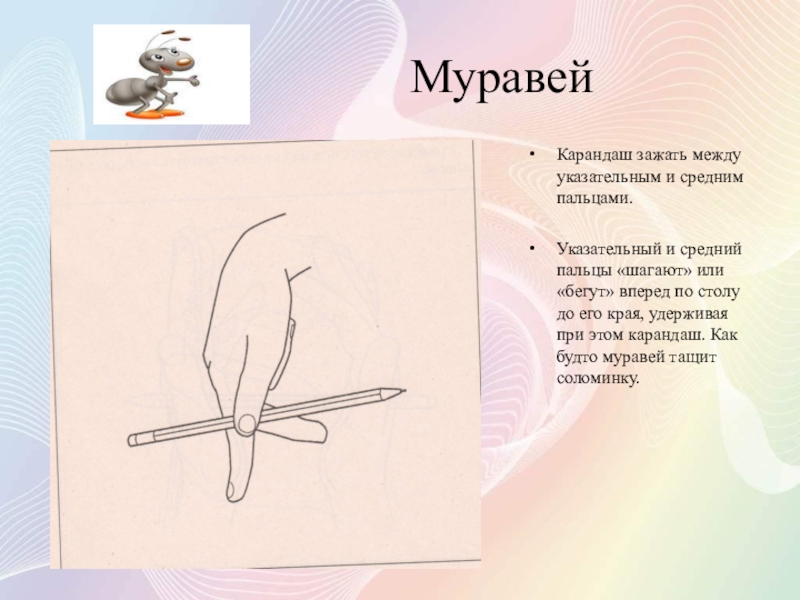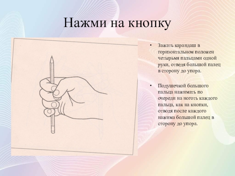 Разместить карандаш так, чтобы мизинец и указательный пальцы были на карандаше, а средний и безымянный – под ней.