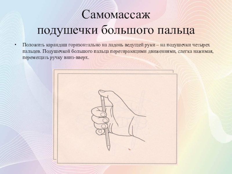 Не поднимая со стола ладонь, подушечкой большого пальца «стереть пятнышко» на подушечке среднего пальца. После этого отвести большой палец в И.П., не выпуская карандаш.