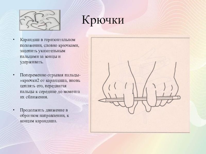 пальцем другой руки обхватить свободную часть карандаша сообразно движению змеи. Повторять поочередно для всех пальцев.