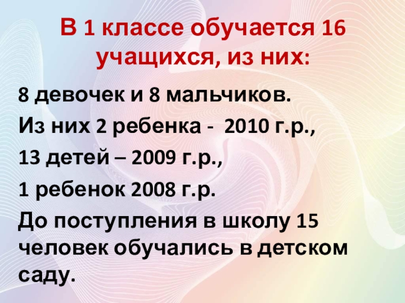Слайд 2В 1 классе обучается 16 учащихся, из них: