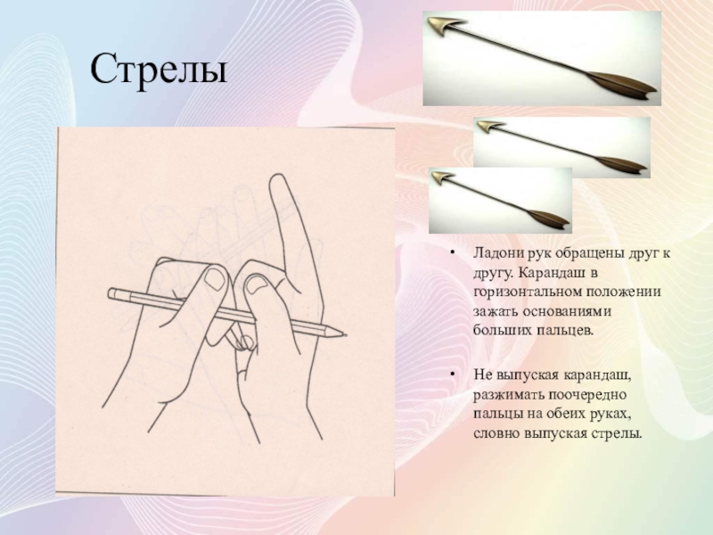 Не выпуская карандаш, разжимать поочередно пальцы на обеих руках, словно выпуская стрелы.