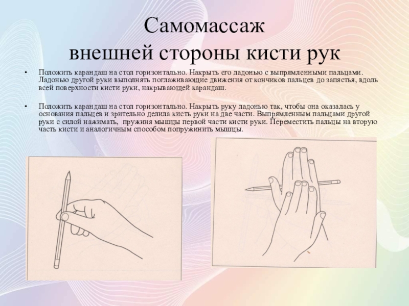 Положить кисть одной руки на стол, выпрямить пальцы. Разместить карандаш