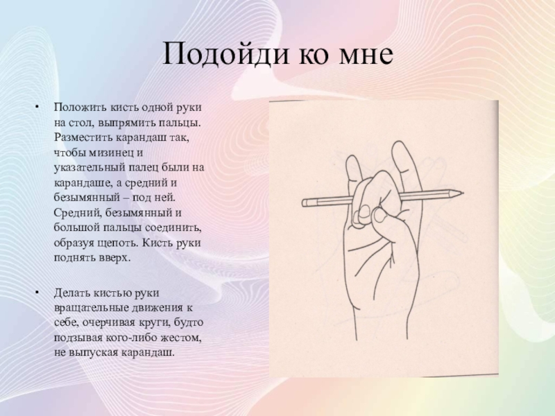 Делать кистью руки вращательные движения к себе, очерчивая круги, будто подзывая кого-либо жестом, не выпуская карандаш.