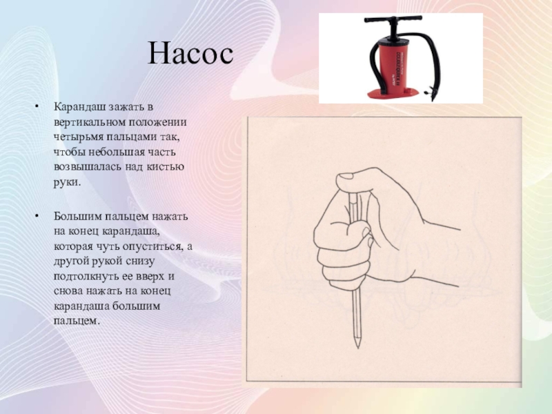 Взять карандаш горизонтально, захватив его до половины пальцами одной руки.