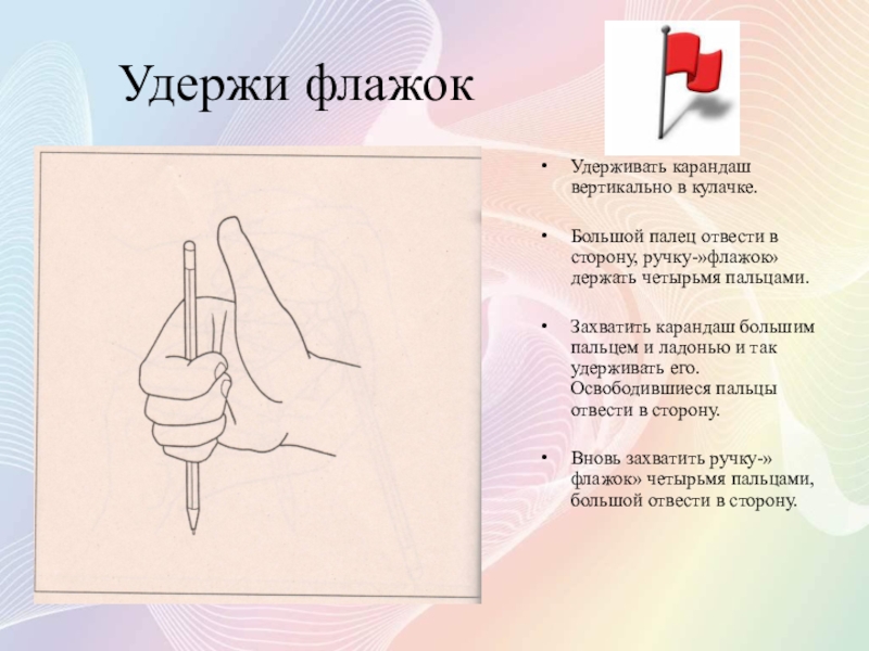 Разместить карандаш так, чтобы мизинец и указательный палец были на карандаше, а средний и безымянный – под ней. Средний, безымянный и большой пальцы соединить, образуя щепоть. Кисть руки поднять вверх.