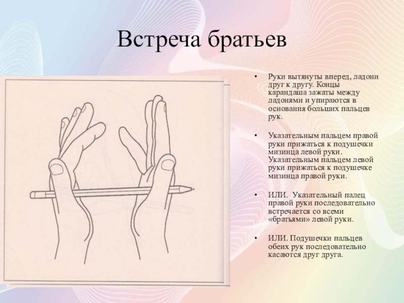Концы карандаша находятся между основаниями среднего и безымянного пальцев обеих рук. Над горизонтально расположенным карандашом сделать устойчивую крышу указательным, средним и безымянным пальцами.
