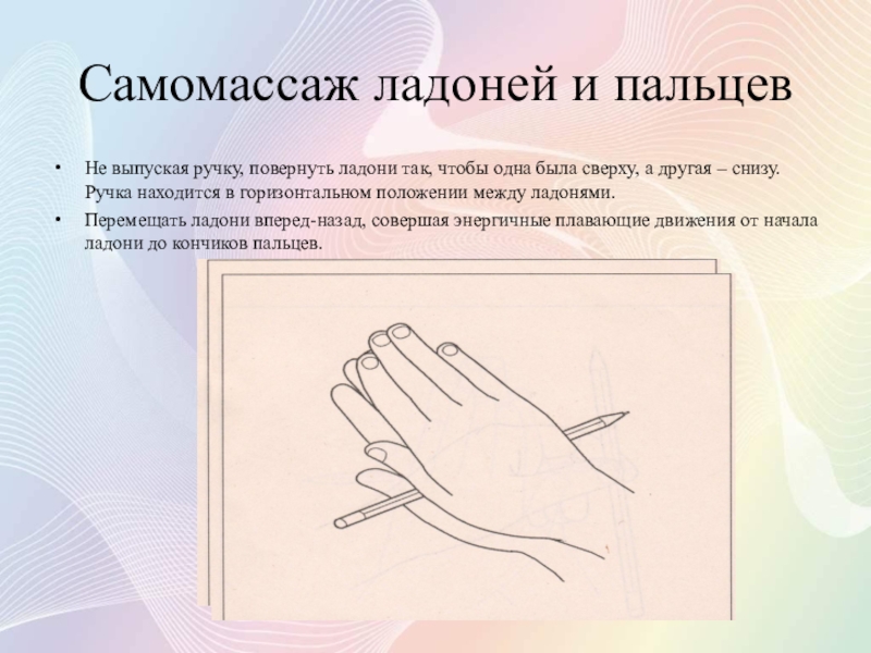 Ладони рук обращены друг к другу. Карандаш в горизонтальном положении