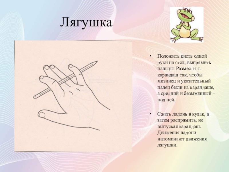 Сжать ладонь в кулак, а затем распрямить, не выпуская карандаш. Движения ладони напоминают движения лягушки.