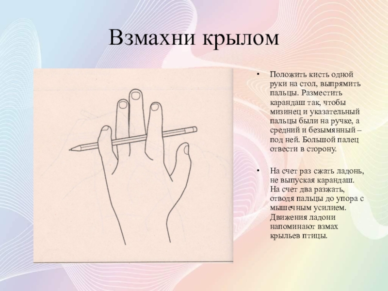 На счет раз сжать ладонь, не выпуская карандаш. На счет два разжать, отводя пальцы до упора с мышечным усилием. Движения ладони напоминают взмах крыльев птицы.