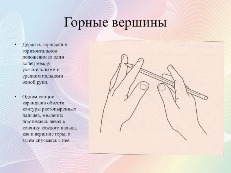 Одним концом карандаша обвести контуры растопыренных пальцев, медленно поднимаясь вверх к кончику каждого пальца, как к вершине горы, а затем спускаясь с нее.