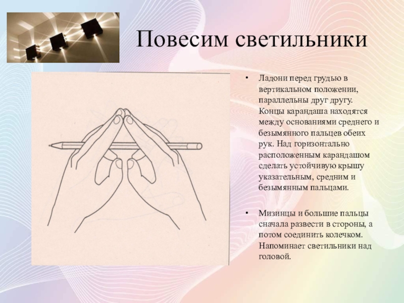 Мизинцы и большие пальцы сначала развести в стороны, а потом соединить колечком. Напоминает светильники над головой.