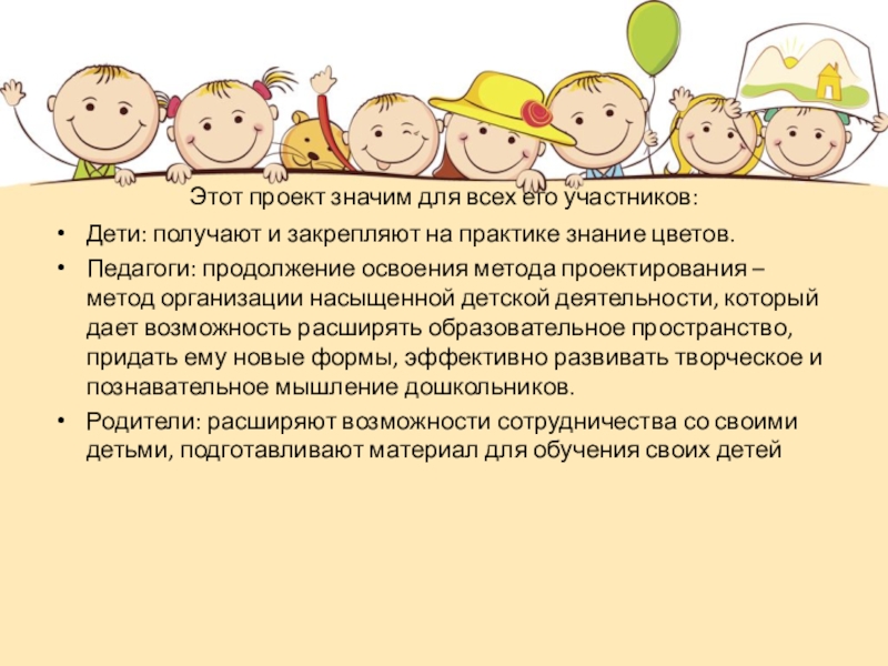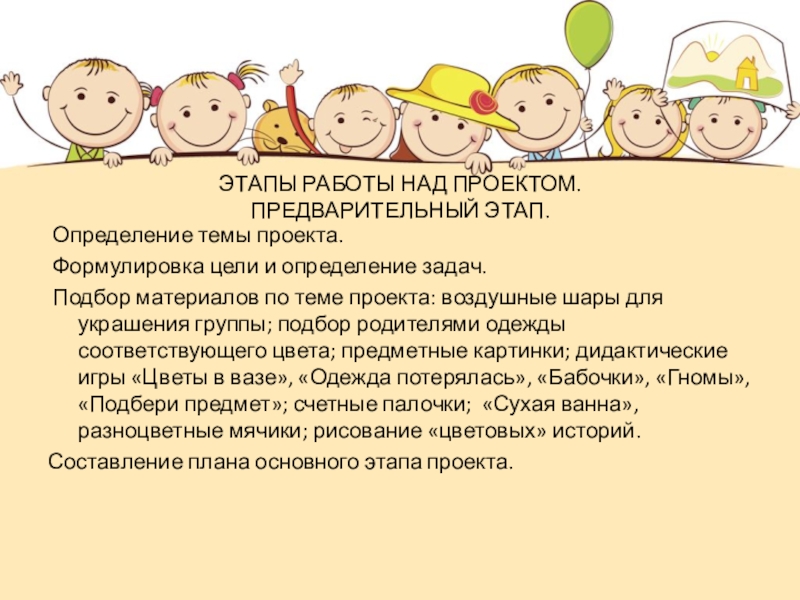 Подбор материалов по теме проекта: воздушные шары для украшения группы; подбор родителями одежды соответствующего цвета; предметные картинки; дидактические игры «Цветы в вазе», «Одежда потерялась», «Бабочки», «Гномы», «Подбери предмет»; счетные палочки; «Сухая ванна», разноцветные мячики; рисование «цветовых» историй.