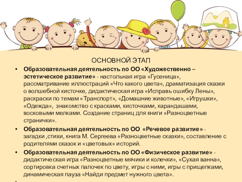 игра «Гусеница», рассматривание иллюстраций «Что какого цвета», драматизация сказки о волшебной кисточке, дидактическая игра «Исправь ошибку Лены», раскраски по темам «Транспорт», «Домашние животные», «Игрушки», «Одежда», знакомство с красками, кисточками, карандашами, восковыми мелками. Создание страниц для книги «Разноцветные странички».