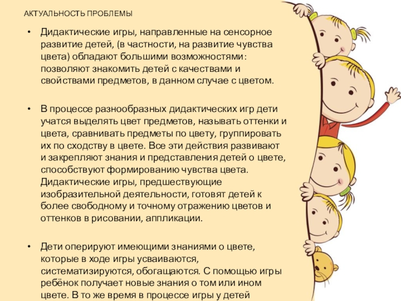 В процессе разнообразных дидактических игр дети учатся выделять цвет предметов, называть оттенки и цвета, сравнивать предметы по цвету, группировать их по сходству в цвете. Все эти действия развивают и закрепляют знания и представления детей о цвете, способствуют формированию чувства цвета. Дидактические игры, предшествующие изобразительной деятельности, готовят детей к более свободному и точному отражению цветов и оттенков в рисовании, аппликации.