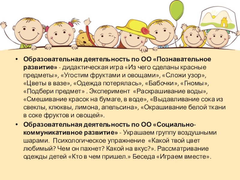 Образовательная деятельность по ОО «Социально-коммуникативное развитие» - Украшаем группу воздушными шарами. Психологическое упражнение «Какой твой цвет любимый? Чем он пахнет? Какой на вкус?». Рассматривание одежды детей «Кто в чем пришел.» Беседа «Играем вместе».