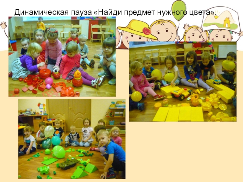 Слайд 11Динамическая пауза «Найди предмет нужного цвета».