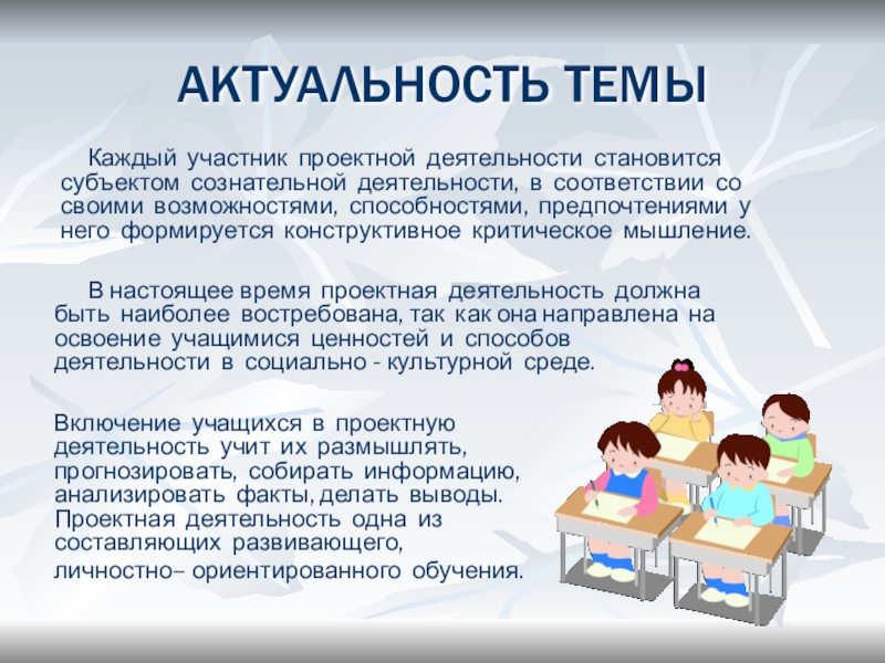 Каждый участник проектной деятельности становится субъектом сознательной деятельности, в соответствии со своими возможностями, способностями, предпочтениями у него формируется конструктивное критическое мышление.