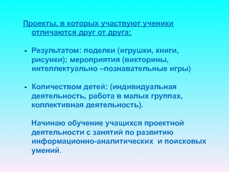 Начинаю обучение учащихся проектной деятельности с занятий по развитию информационно-аналитических и поисковых умений.