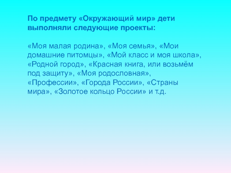 По предмету «Окружающий мир» дети выполняли следующие проекты: