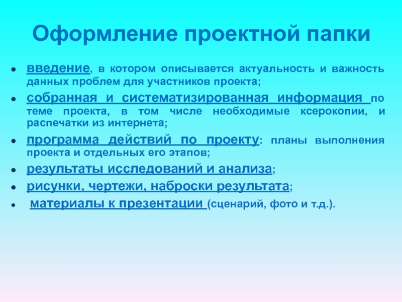 собранная и систематизированная информация по теме проекта, в том числе необходимые ксерокопии, и распечатки из интернета;