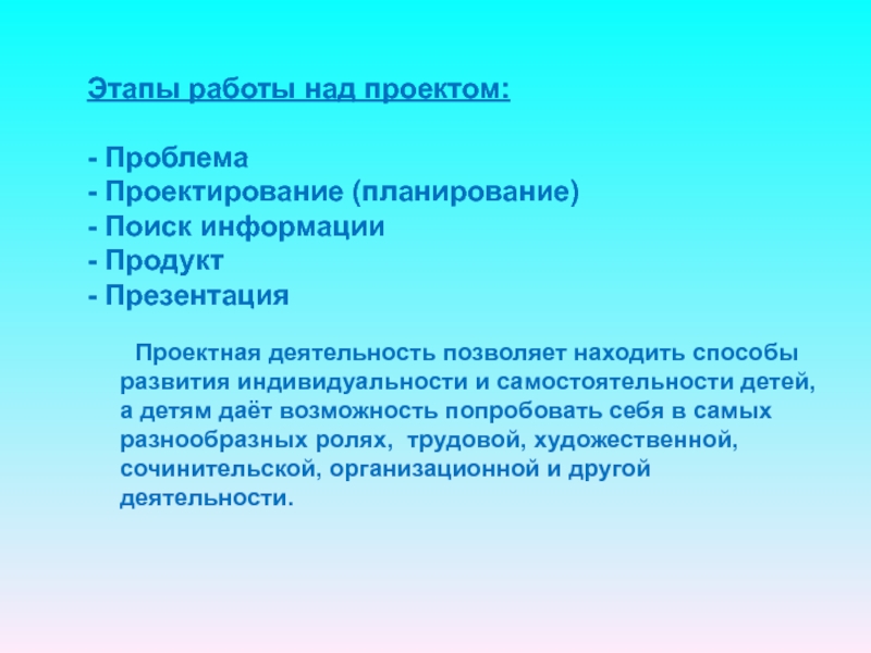 Проектная деятельность позволяет находить способы развития индивидуальности и самостоятельности детей, а детям даёт возможность попробовать себя в самых разнообразных ролях, трудовой, художественной, сочинительской, организационной и другой деятельности.