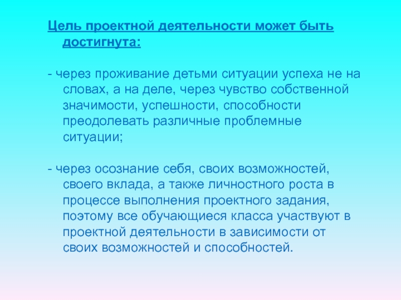 - через осознание себя, своих возможностей, своего вклада, а также личностного роста в процессе выполнения проектного задания, поэтому все обучающиеся класса участвуют в проектной деятельности в зависимости от своих возможностей и способностей.