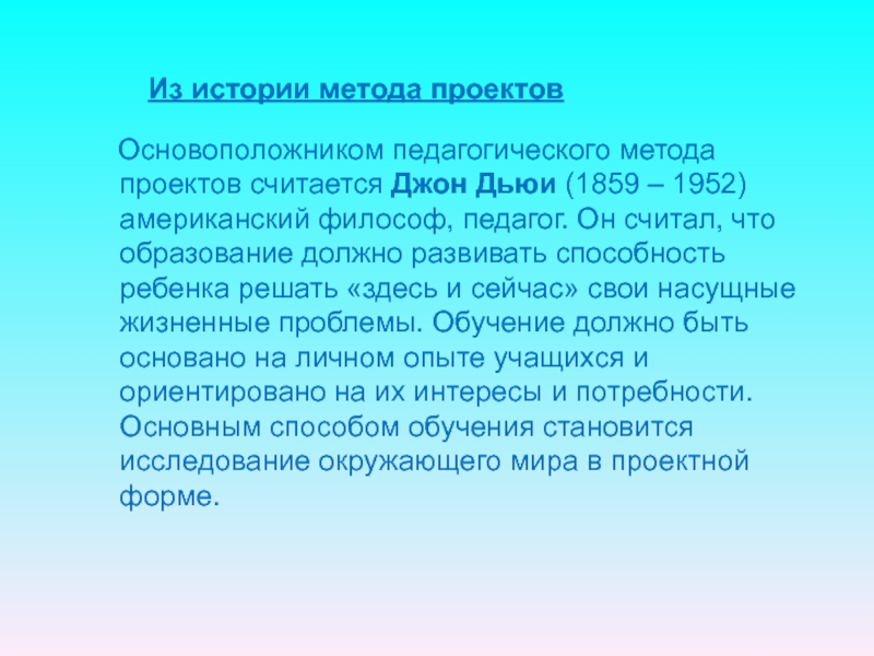 Основоположником педагогического метода проектов считается Джон Дьюи (1859 – 1952) американский философ, педагог. Он считал, что образование должно развивать способность ребенка решать «здесь и сейчас» свои насущные жизненные проблемы. Обучение должно быть основано на личном опыте учащихся и ориентировано на их интересы и потребности. Основным способом обучения становится исследование окружающего мира в проектной форме.