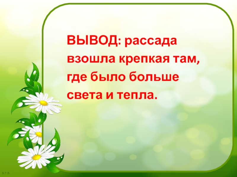 Слайд 9ВЫВОД: рассада взошла крепкая там, где было больше света и тепла.