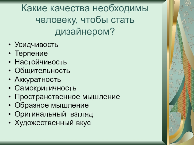 Слайд 25Какие качества необходимы человеку, чтобы стать дизайнером?
