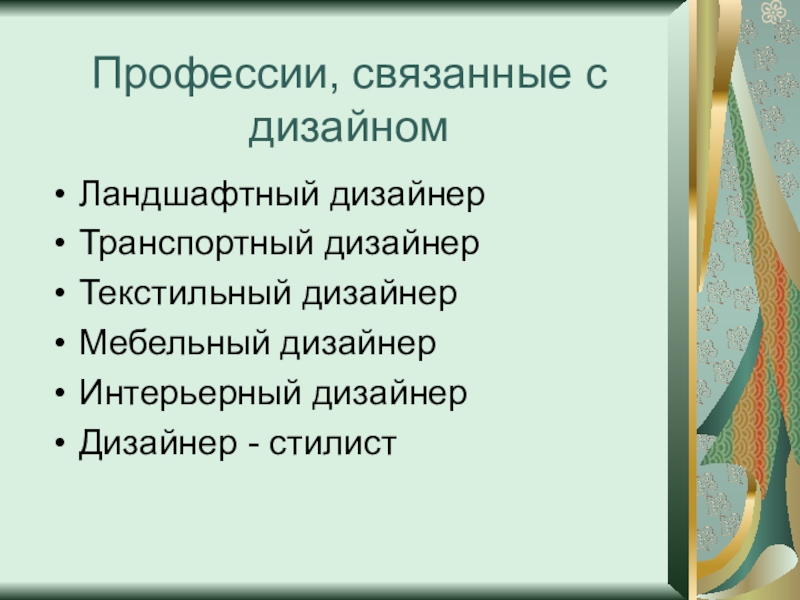 Профессии, связанные с дизайномЛандшафтный дизайнерТранспортный дизайнерТекстильный дизайнерМебельный дизайнерИнтерьерный дизайнерДизайнер - стилист