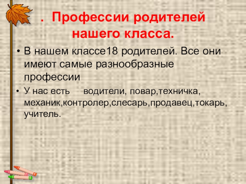 . Профессии родителей нашего класса. В нашем классе18 родителей. Все они имеют самые разнообразные профессииУ нас есть