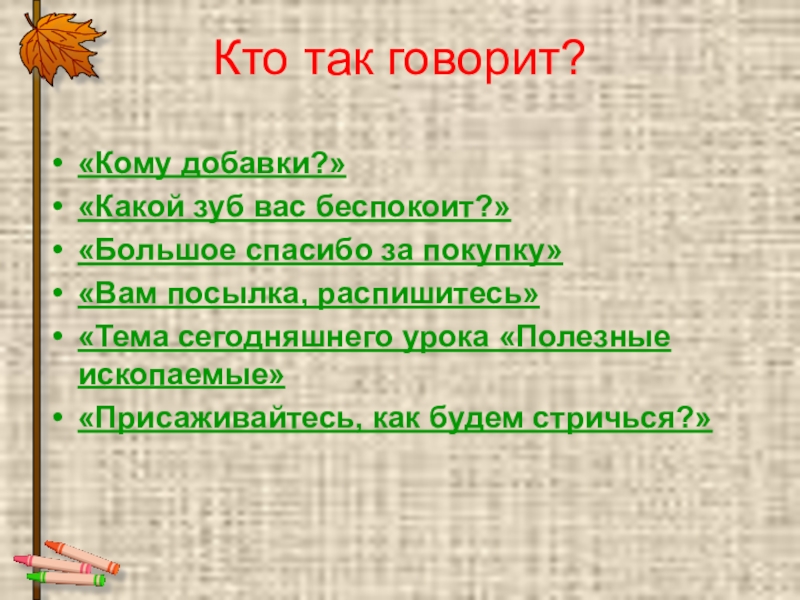 Кто так говорит?«Кому добавки?»«Какой зуб вас беспокоит?»«Большое спасибо за покупку» «Вам посылка, распишитесь»«Тема сегодняшнего урока «Полезные ископаемые»«Присаживайтесь,
