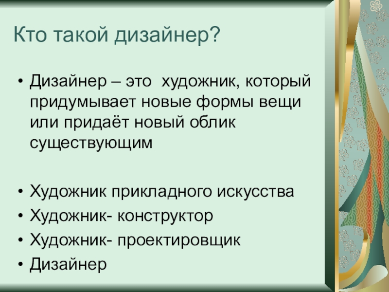 Кто такой дизайнер?Дизайнер – это художник, который придумывает новые формы вещи или придаёт новый облик существующимХудожник прикладного