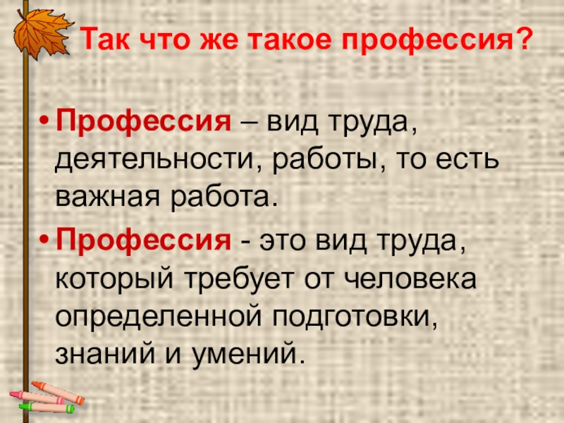 Так что же такое профессия?Профессия – вид труда, деятельности, работы, то есть важная работа.Профессия -